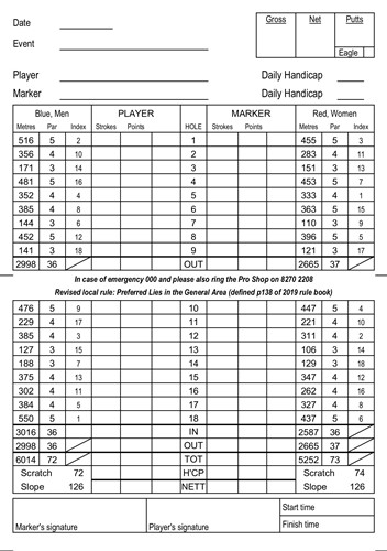 Please record your name as Marker on the score card you are marking. This enables us to resolve uncertainty, for example if a player's score has been altered but it is not clear from the alteration whether the score should be say 5 or 6 - reference to the card the player marked, where they recorded their own scores, may help resolve the uncertainty. Please try to make all numbers clear and easily read. It is difficult to match player and marker when the marker is not recorded.