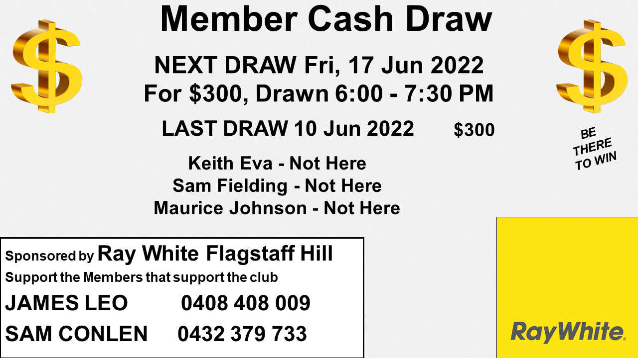 The Member Cash Draw displays live on TV screen in the bar. The prize jackpots each week until won, up to $1000, thanks to James Leo of Ray White Real Estate Flagstaff Hill